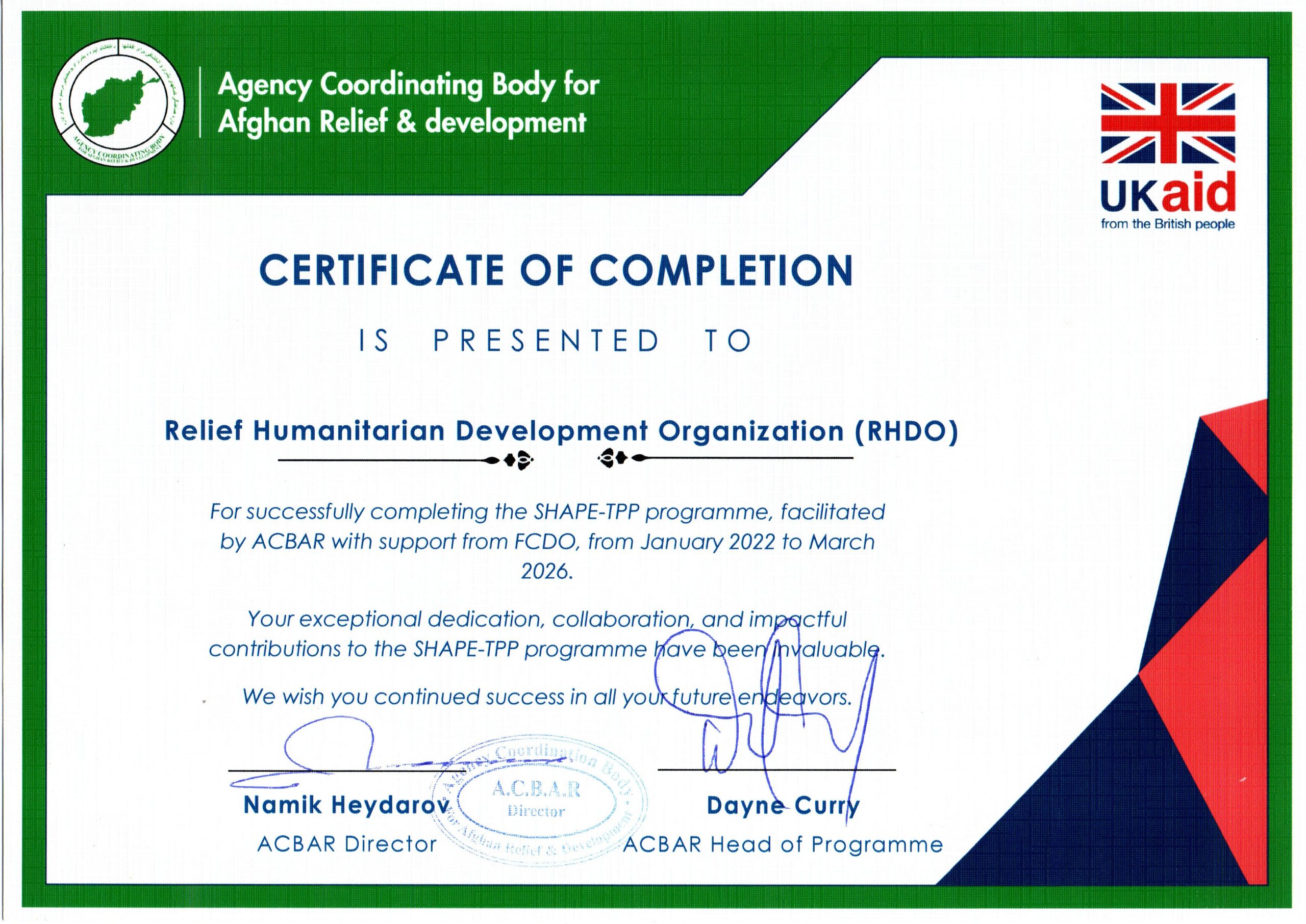 Relief Humanitarian Development Organization (RHDO) is proud to announce the successful completion of the SHAPE-TPP Program, which was facilitated by ACBAR with financial support from FCDO, spanning from January 2022 to March 2026.